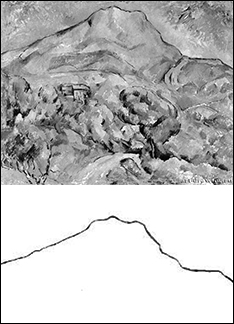Проделаем несколько манипуляций. Вот "ДОРОГА У ГОРЫ СВ. ВИКТОРИИ" (1898- 1902) Сезанна. Теперь выделим из неё контур собственно горы. А теперь сравним этот контур с картиной "АКВЕДУК" (1898-1900). Для определённости наметим на ней белым пунктиром контур Виктории. Видим, что гора, находящаяся вдали, несколько раз заслоняет собою ветку и ствол дерева, находящегося вблизи. Пониже тот же ствол ещё раз заслонён чем-то светлым (помечено белыми точками), что является тоном той же дальней горы, а не ближней листвы, которая тёмно-зелёная. Ещё ниже тот же ствол заслонён дальней яркой зеленью, что под домиками на горе, к которым, собственно и проведён акведук. Что это? Абсурд? Издевательство над здравым смыслом? ClicK Here For More...